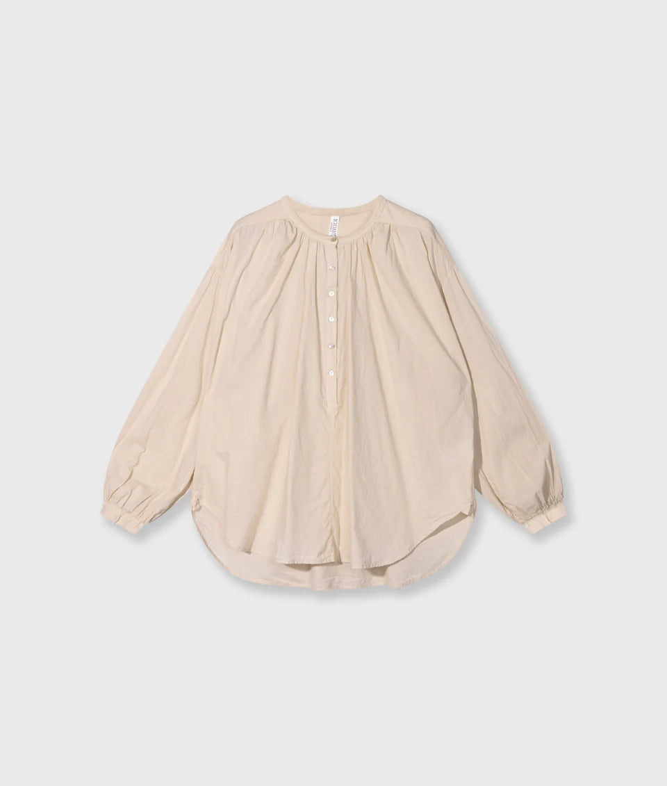 Oversized blouse van GOTS-gecertificeerd biologisch katoen, met een rugpand en manchetten van licht gestructureerd jersey katoen. Ontworpen met een ronde halslijn met geribde kraag, knoopsluiting en gerimpelde details op de schouders, borst en rug. Afgewerkt met een monogramborduursel op de linkermouw, plooien boven de manchetten en een afgeronde zoom.