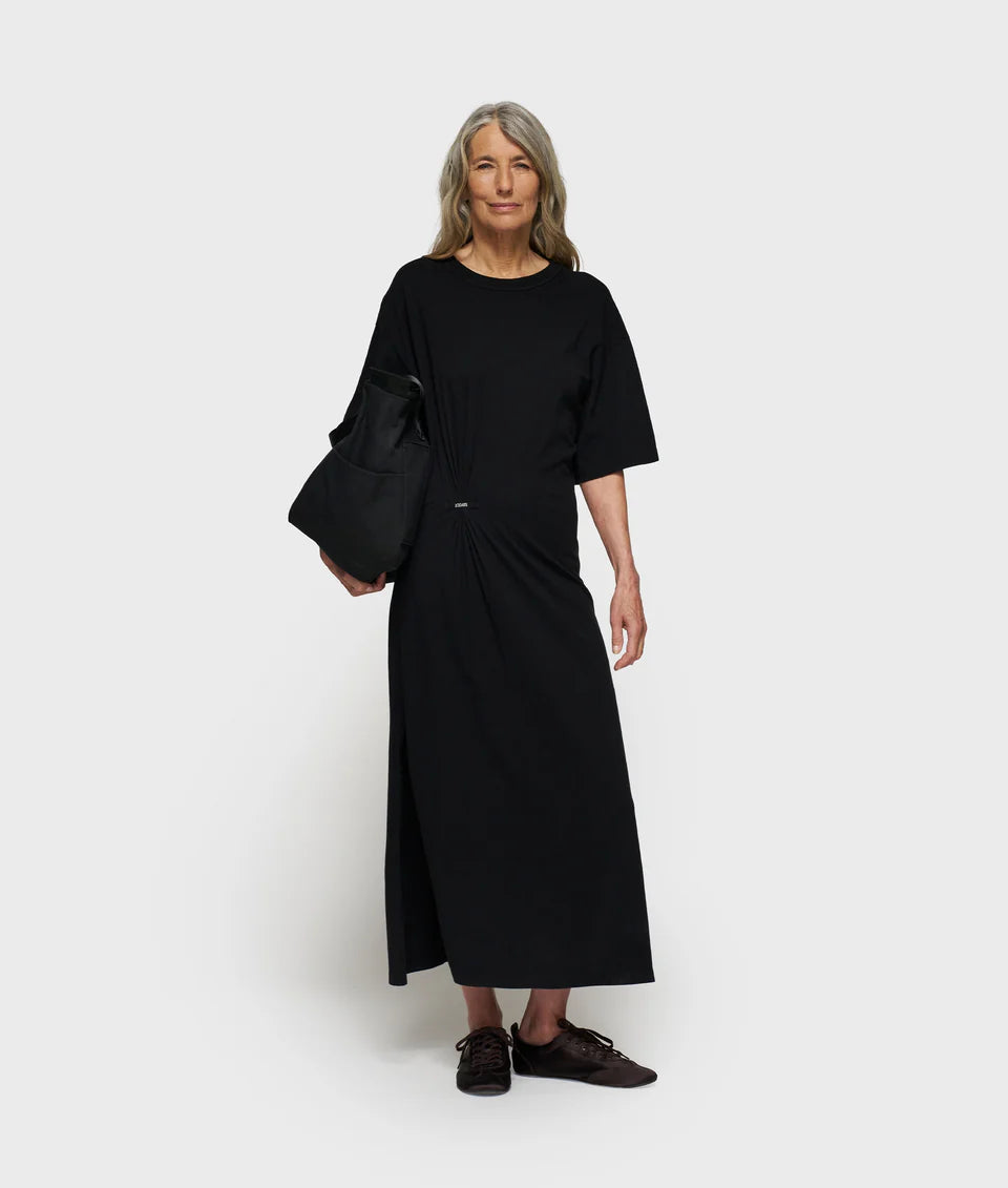 Relaxed fit T-shirtjurk gemaakt van zacht GOTS-gecertificeerd biologisch katoen, met plooidetails aan de voorkant. Ontworpen met een ronde geribde halslijn, korte mouwen en een split aan de zijkant.