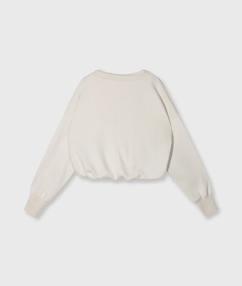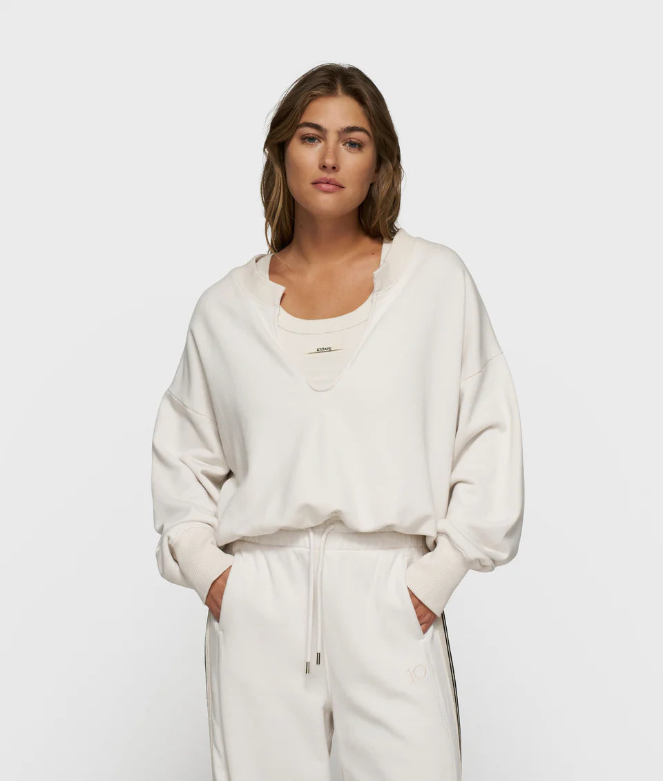 Relaxed fit V-hals trui, gemaakt van zacht katoenen fleece. Voorzien van een vast binnenhemdje met ronde halslijn, een ballonvormige zoom, geribde boorden en een ‘10DAYS’ canvas label op de voorkant van het hemdje.