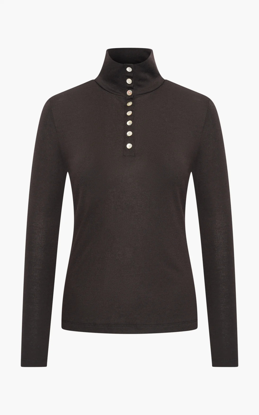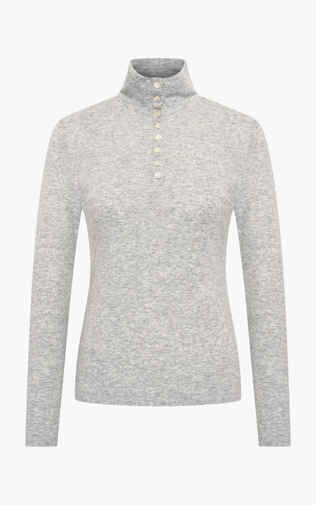De Valke longsleeve is een elegante basic met verfijnde details. Uitgevoerd in zwart en grijs, met een hoge hals en subtiele knoopjes, straalt hij eenvoud en klasse uit.